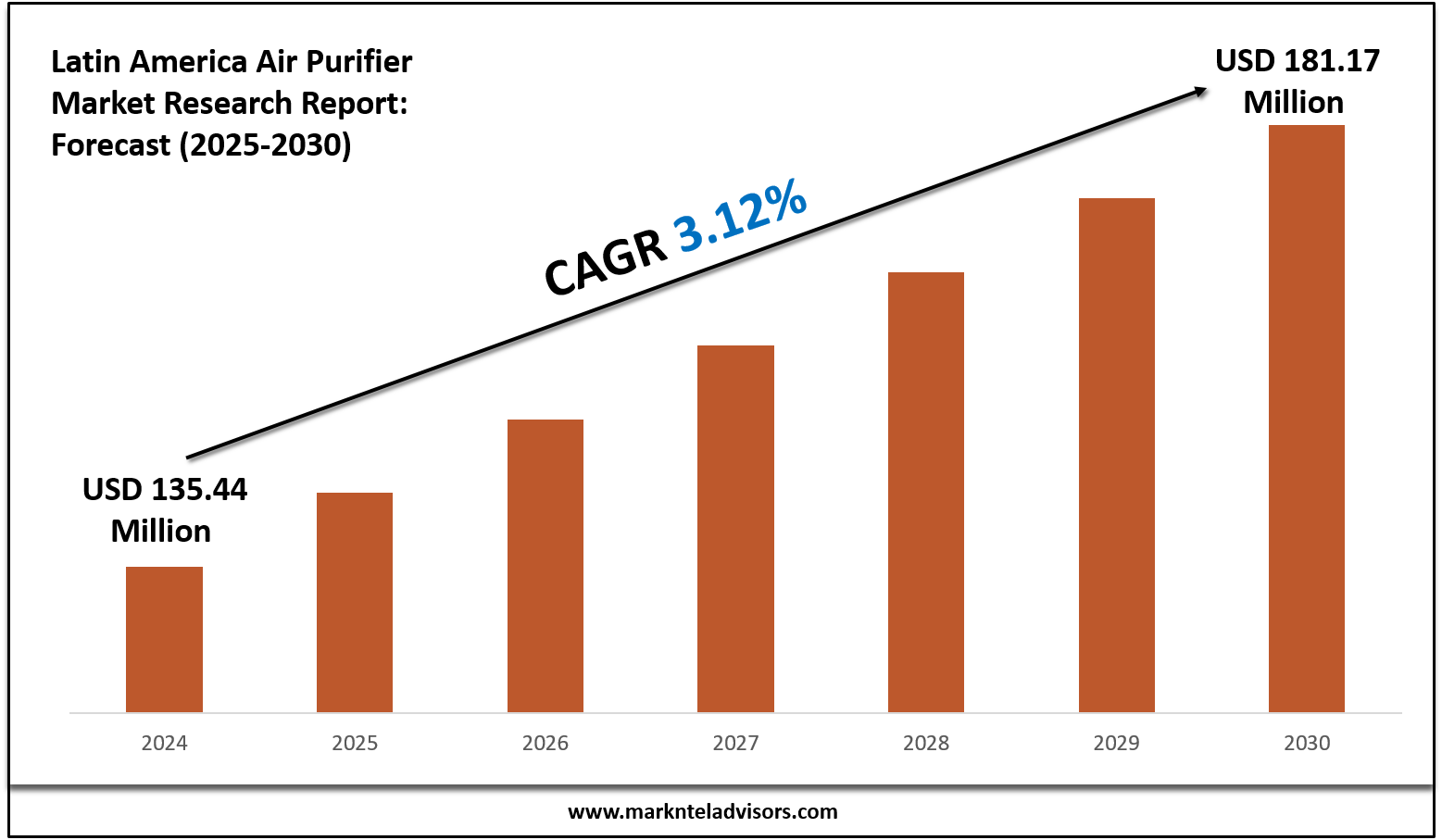 The Latin America Air Purifier Market is experiencing significant growth, with a market size valued at approximately USD 135.44 million in 2024. Forecasts indicate that this market will surge to USD 181.17 million by 2030, achieving a compound annual growth rate (CAGR) of 3.12%. Key drivers propelling this growth include escalating air quality index (AQI) levels, government regulations surrounding indoor air quality, and increasing consumer health consciousness. As urbanization accelerates and industrial activities rise, the demand for air purifiers is expected to witness a steady uptick in the region.